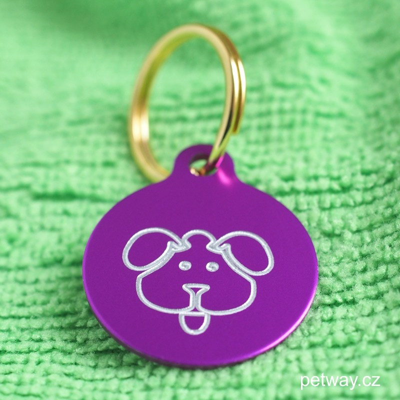 ID psí identifikační známka z eloxovaného hliníku ve tvaru kolečka o průměru 25 mm.