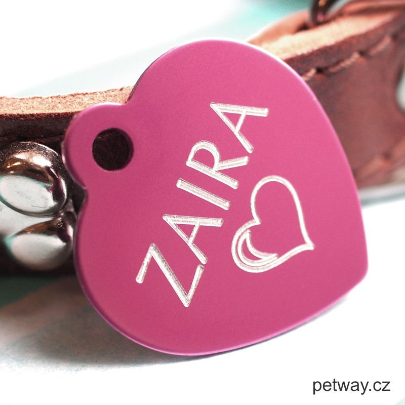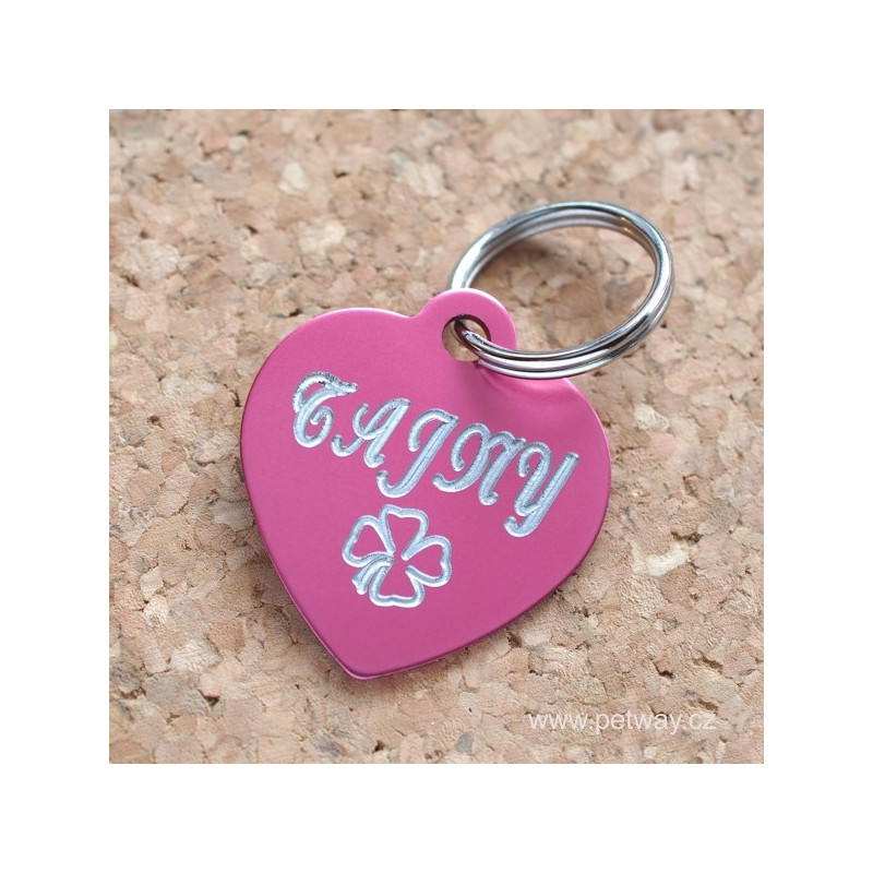 Identifikační psí známka z eloxovaného hliníku. Vylaserovaný text stříbrné barvy vytváří pěkný kontrast s růžovým podkladem. Gravírování textu možné z obou stran. Ke každé psí známce automaticky přibalíme kroužek pro upevnění na obojek.