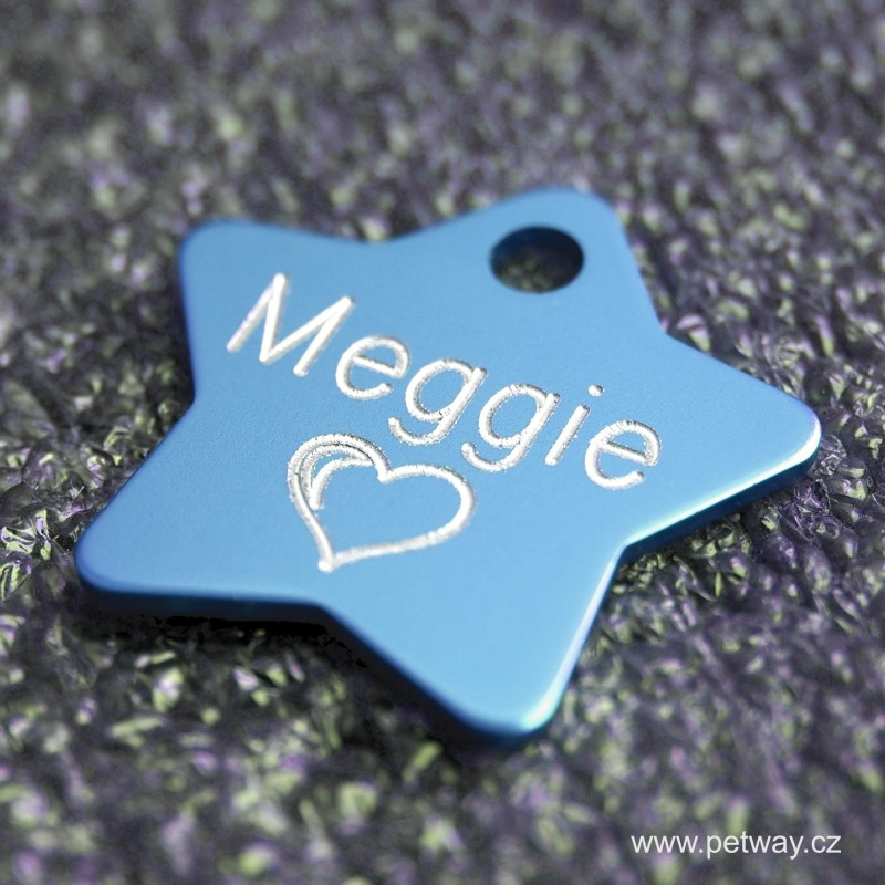 Tagiska pro psa z eloxovaného hliníku s oboustranným rytím. Gravírované údaje stříbrné barvy vytváří pěkný kontrast s barevným povrchem. Hlavní předností známky pro psy je nízká hmotnost. Tvar hvězda je relativně větších rozměrů, proto není vhodná pro nejmenší psy. Ke každé psí známce automaticky přibalíme kroužek pro upevnění na obojek.