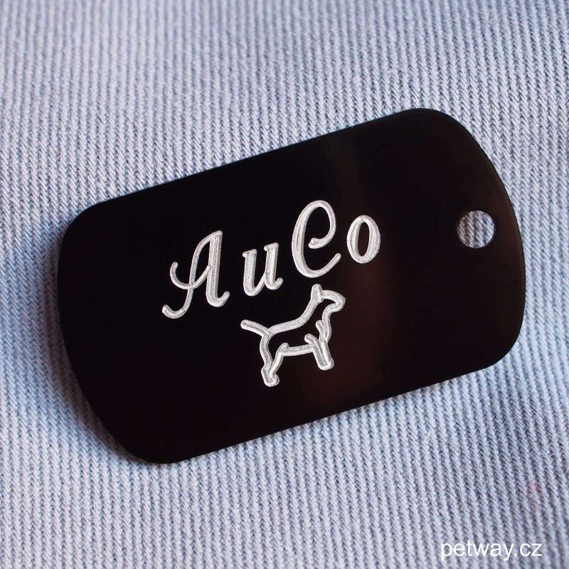 Identifikační psí známka "vojenského" typu, vyrobená z eloxovaného hliníku. Vylaserovaný text stříbrné barvy vytváří pěkný kontrast s černým povrchem a je tedy velmi snadno čitelný. Ke každé známce automaticky přibalíme kroužek pro upevnění na obojek.