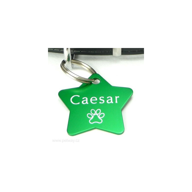 Tagiska pro psa z eloxovaného hliníku s oboustranným gravírováním laserem. Laserovaný text stříbrné barvy vytváří pěkný kontrast se zelenou barvou. Hlavní předností známky pro psy je nízká hmotnost. Tvar hvězda je relativně větších rozměrů, proto není vhodná pro nejmenší psy. Ke každé psí známce automaticky přibalíme kroužek pro upevnění na obojek.