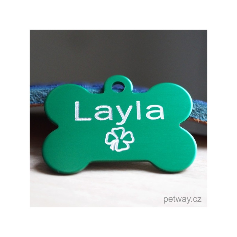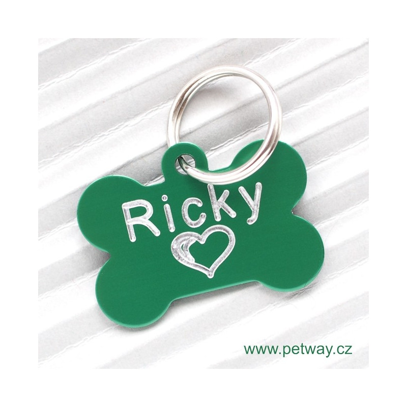 Identifikační psí známka pro psa z eloxovaného hliníku. Vygravírovaný text stříbrné barvy je pěkně čitelný na zeleném povrchu. Nejprodávanější typ psí známky! Ke každé tagisce automaticky přibalíme kroužek pro upevnění na obojek.