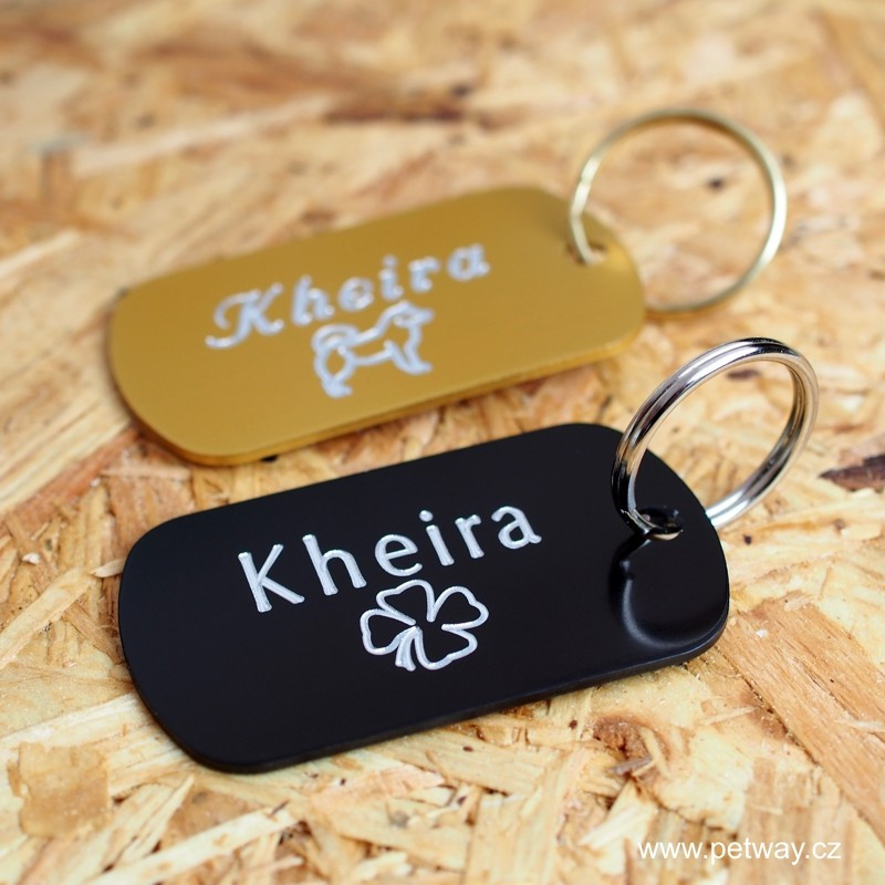 Identifikační psí známka "vojenského" typu, vyrobená z eloxovaného hliníku. Laserovaný text stříbrné barvy vytváří pěkný kontrast s zlatým povrchem a je tedy velmi snadno čitelný. Ke každé známce automaticky přibalíme kroužek pro upevnění na obojek.
