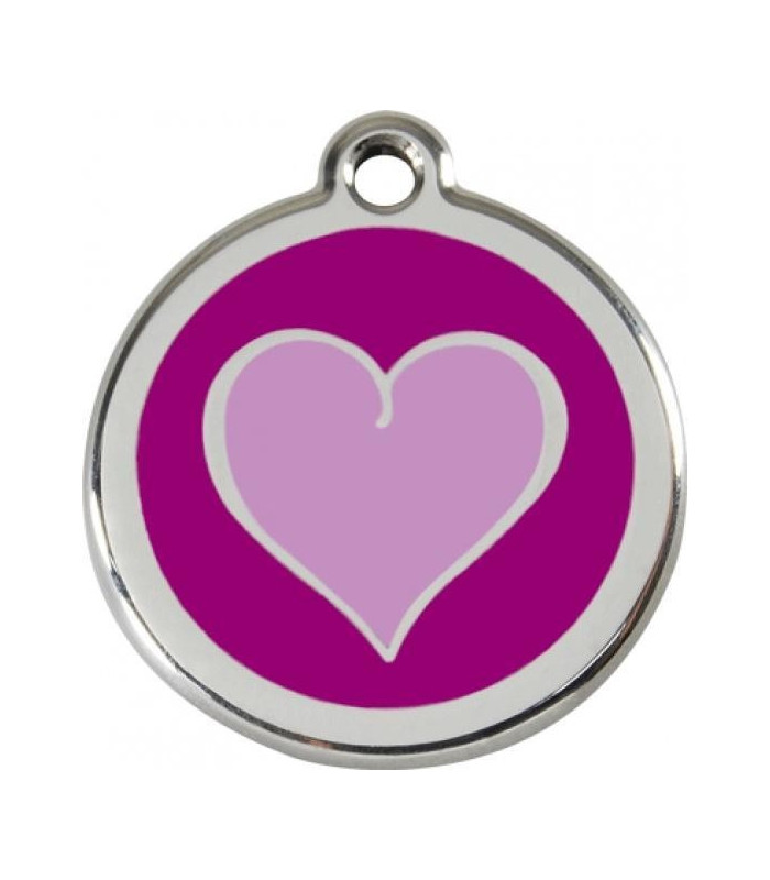 Nejmenší nerezová identifikační známka pro psy. Na přední straně je srdce na fialovém podkladu. Zadní je určena k rytí textu. Psí známky Red Dingo o rozměrech 20 mm jsou vhodné i pro nejmenší pejsky. Ke každé známce přibalíme zdarma klíčový kroužek.
