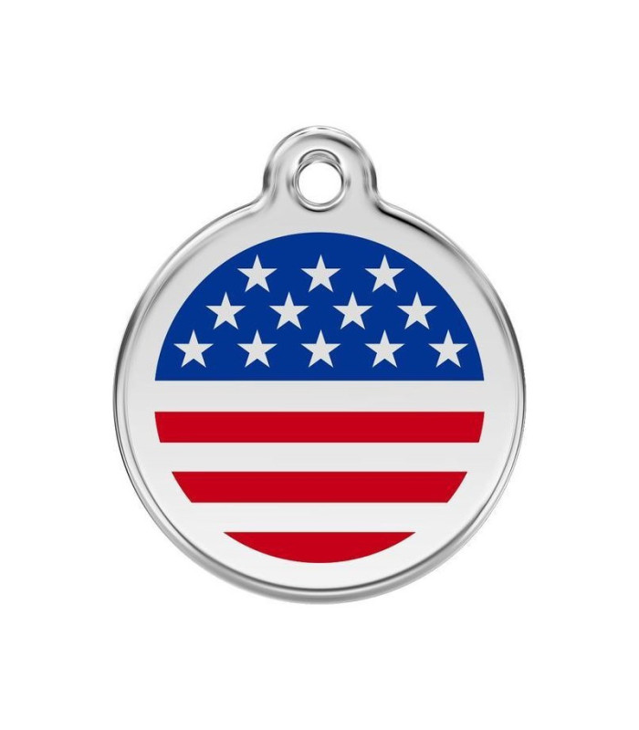 Nejmenší nerezová identifikační známka. Na přední straně je vlajka USA. Zadní strana je určena k vyrytí Vámi zvolených údajů. Psí známky Red Dingo o rozměrech 20 mm jsou vhodné i pro nejmenší pejsky. Ke každé známce přibalíme zdarma klíčový kroužek.