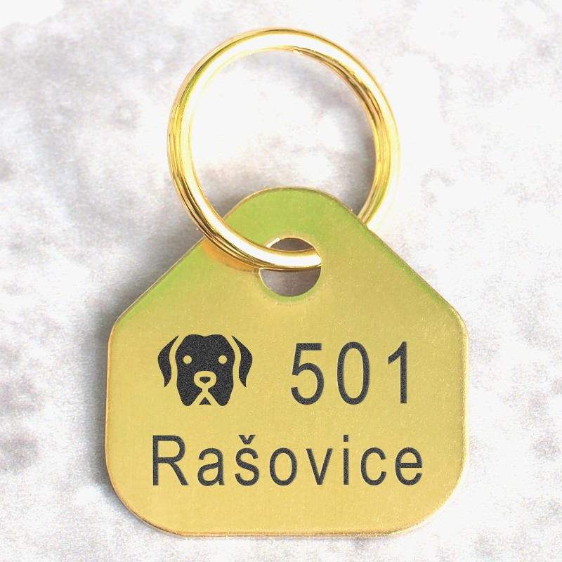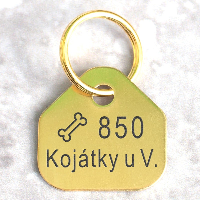 Obecní registrační psí známky s číslem a názvem obce ve tvaru domečku