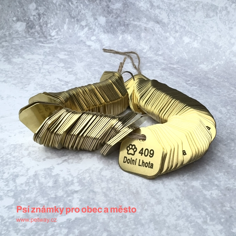 Registrační psí známky pro obec a město v počtu 1000 ks s gravírováním číselné řady a názvu obce. Psí známky jsou zabaleny dle číselného pořadí a za příplatek 2 Kč/ks mohou být navlečeny na klíčový kroužek. Registrační známky budou gravírovány fontem Arial pro jeho jednoduchost a snadnou čitelnost. Na druhou stranu známky si od nás můžete nechat zvěčnit logo či znak města, obecní symboly apod. Více zde.