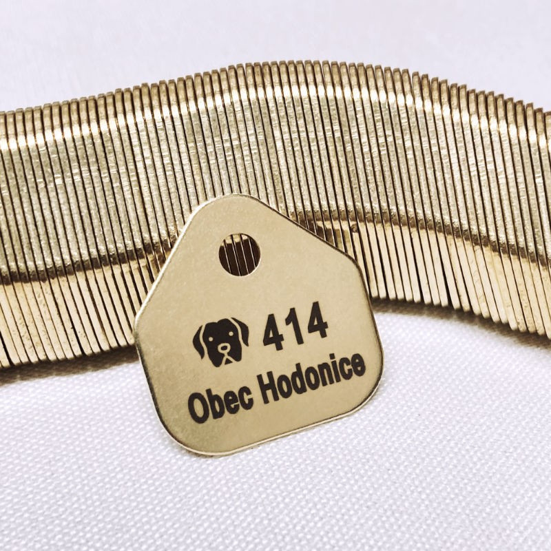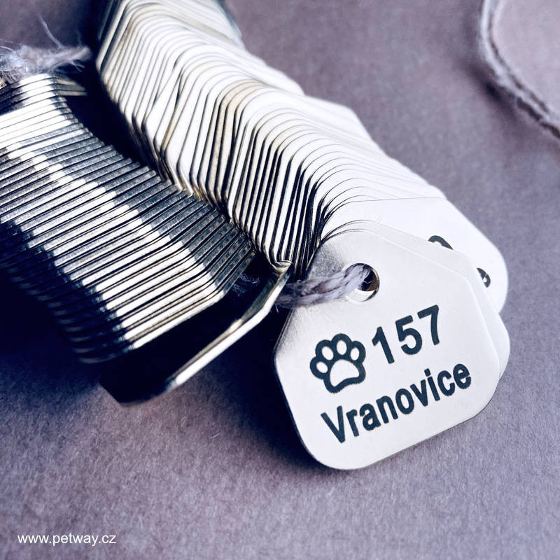 Identifikační registrační obecní známky pro psy v počtu 200 ks s gravírováním číselné řady a názvu obce. Známky jsou zabaleny dle číselného pořadí a za příplatek 2 Kč/ks mohou být navlečeny na klíčový kroužek. ID známky budou gravírovány fontem Arial pro jeho jednoduchost a snadnou čitelnost. Na druhou stranu známky si od nás můžete nechat zvěčnit logo či znak města, obecní symboly apod. Více zde.
