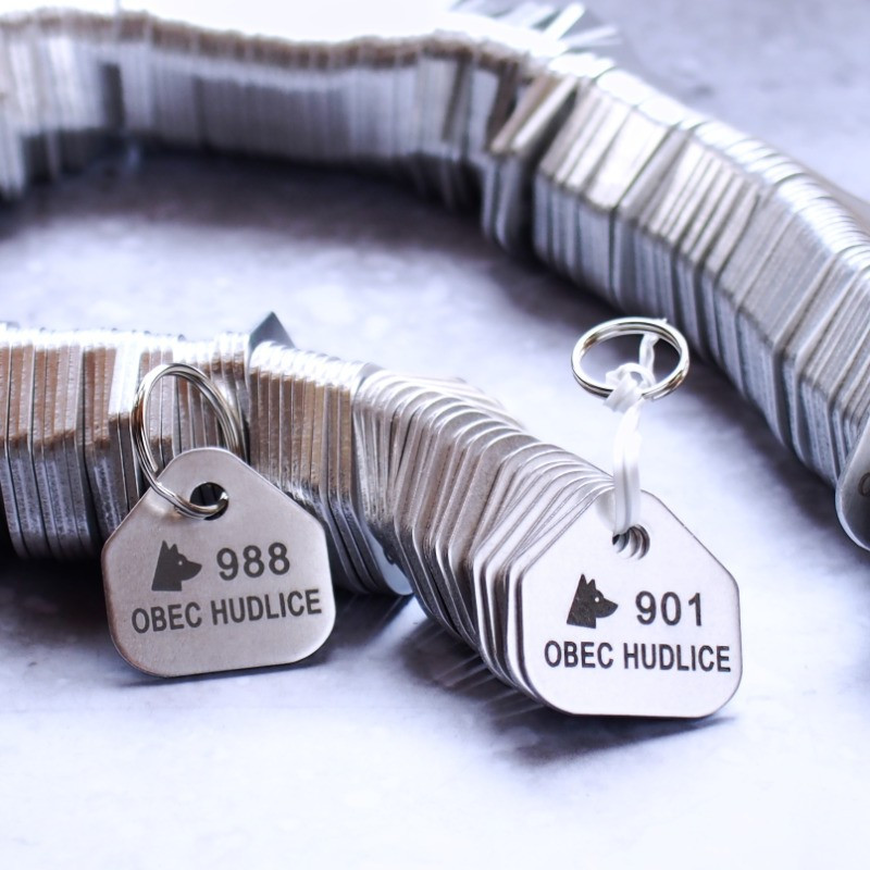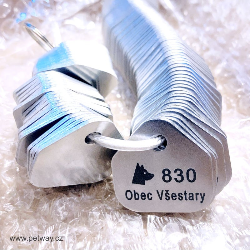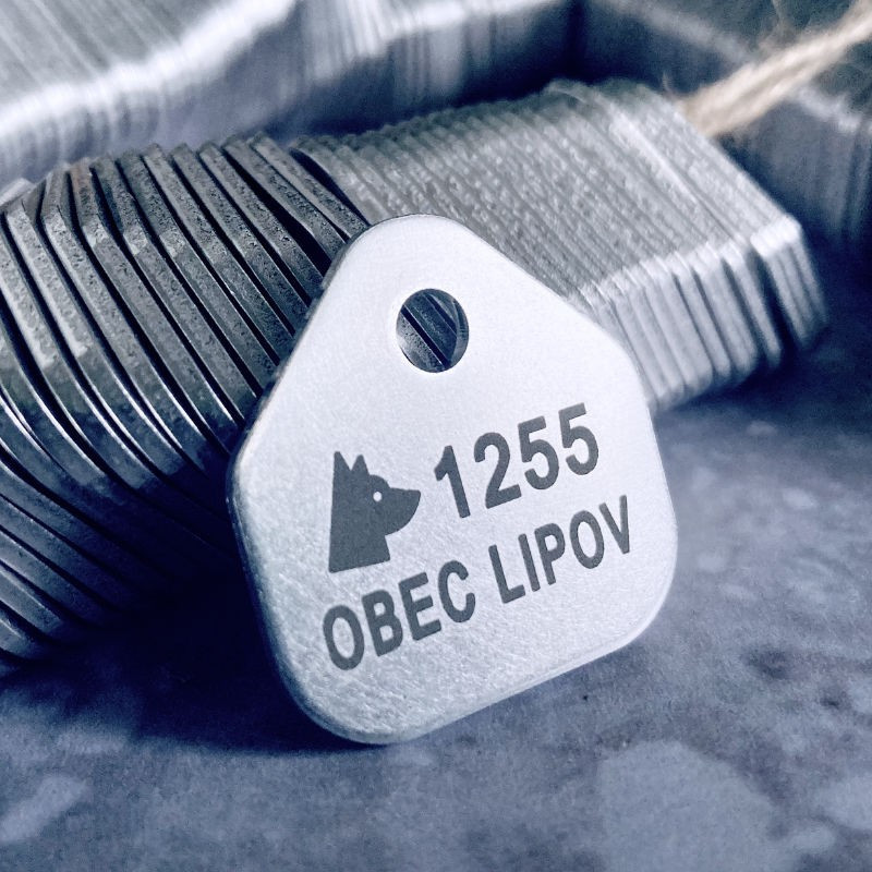 Registrační psí známky pro účely povinné registrace psů v obci v počtu 1000 ks s gravírováním číselné řady a názvu obce. Známky jsou zabaleny dle číselného pořadí a za příplatek 2 Kč/ks mohou být navlečeny na klíčový kroužek. Registrační známky budou gravírovány fontem Arial pro jeho jednoduchost a snadnou čitelnost. Na druhou stranu známky si od nás můžete nechat zvěčnit logo či znak města, obecní symboly apod. Více zde.
