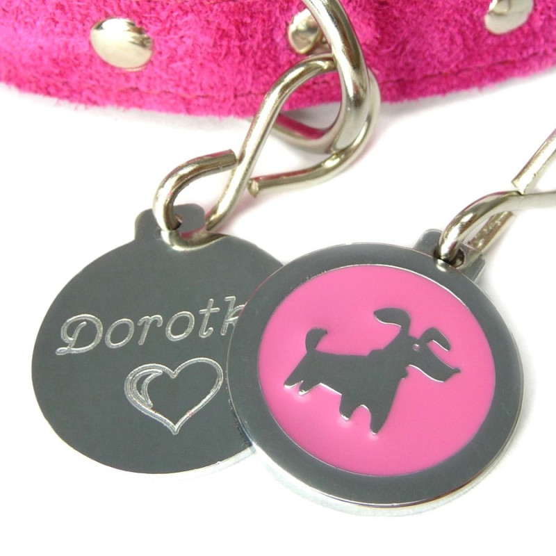 Malý smaltovaný identifikační přívěsek pro psy. Na přední traně je symbol psa na růžovém pozadí. Zadní strana je určena k vyrytí Vámi zvolených údajů. Malé smaltované známky pro psy jsou díky své velikosti 25 mm vhodné pro malé psy.