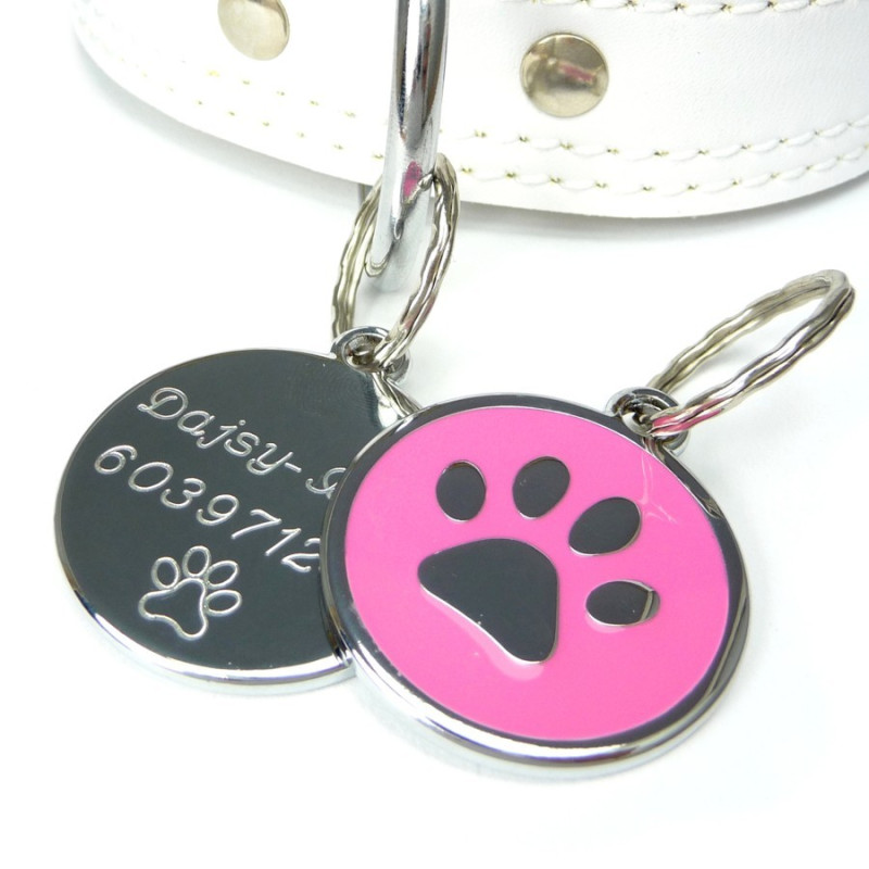 Smaltovaná identifikační známka pro psy. Na přední straně je packa na růžovém pozadí. Zadní strana je určena k vyrytí Vámi zvolených údajů. Tyto střední smaltované známky pro psy jsou díky své velikosti 30 mm vhodné pro středně a velké psy.