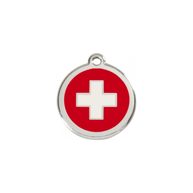 Velká nerezová známka pro psa Red Dingo s gravírováním. Identifikační údaje - jméno, tel. čísla, adresa majitele atd. budou na známce jasně viditelné a snadno čitelné po celou dobu životnosti známky. Na přední straně je symbol kříže na červeném pozadí. Na zadní stranu Vám gravírujeme jméno, telefon, adresu, obrázek z naší nabídky apod. Psí známky Red Dingo o rozměrech 30 mm jsou vhodné pro středně velké a velké psy. Ke každé známce náleží originální nerezový kroužek k připevnění známky na obojek.