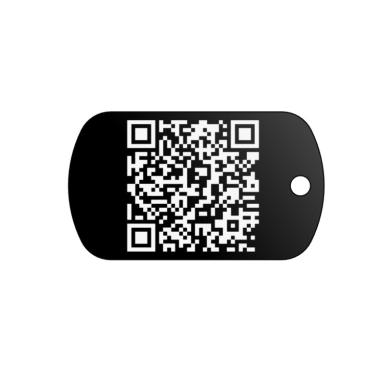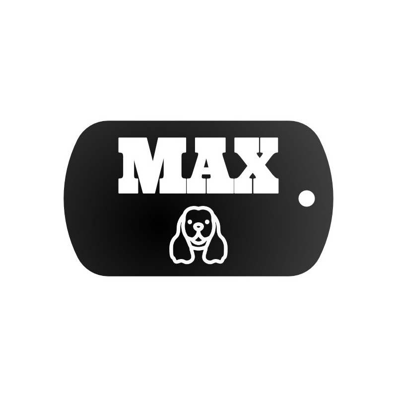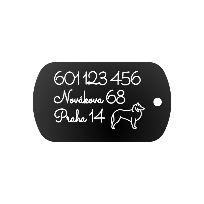 Vojenská černá psí známka s gravírováním textu a grafiky